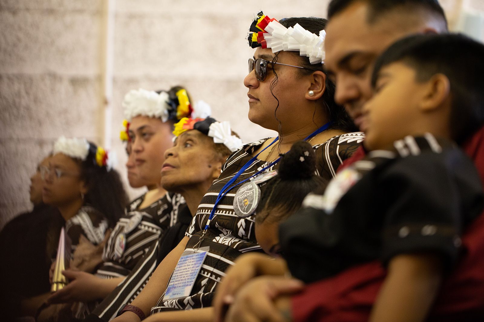 To honor his Tuvaluan side and his love for traditional dance, family members had worn ceremonial headgear in red, black, yellow and white during Saturday's service.