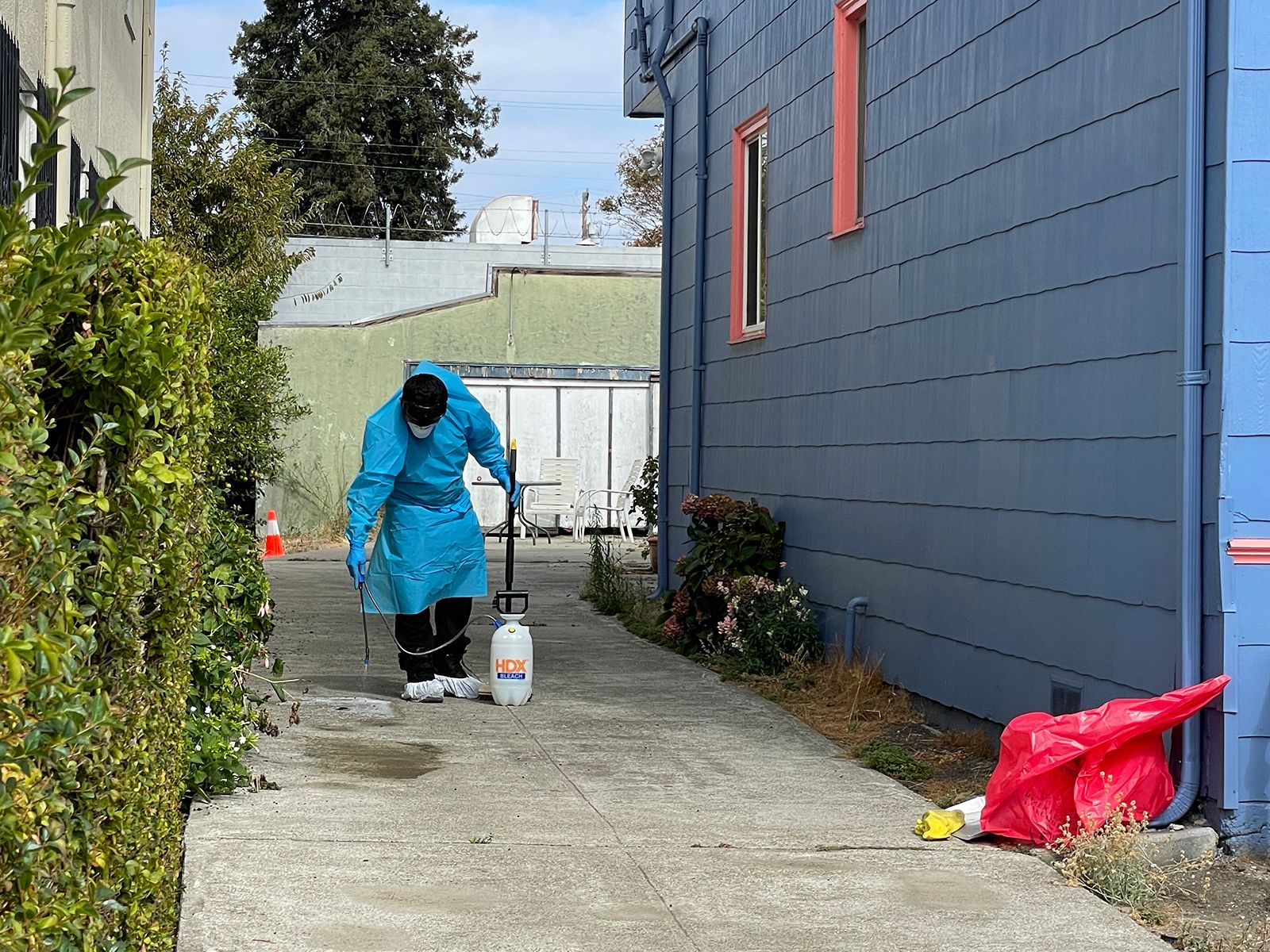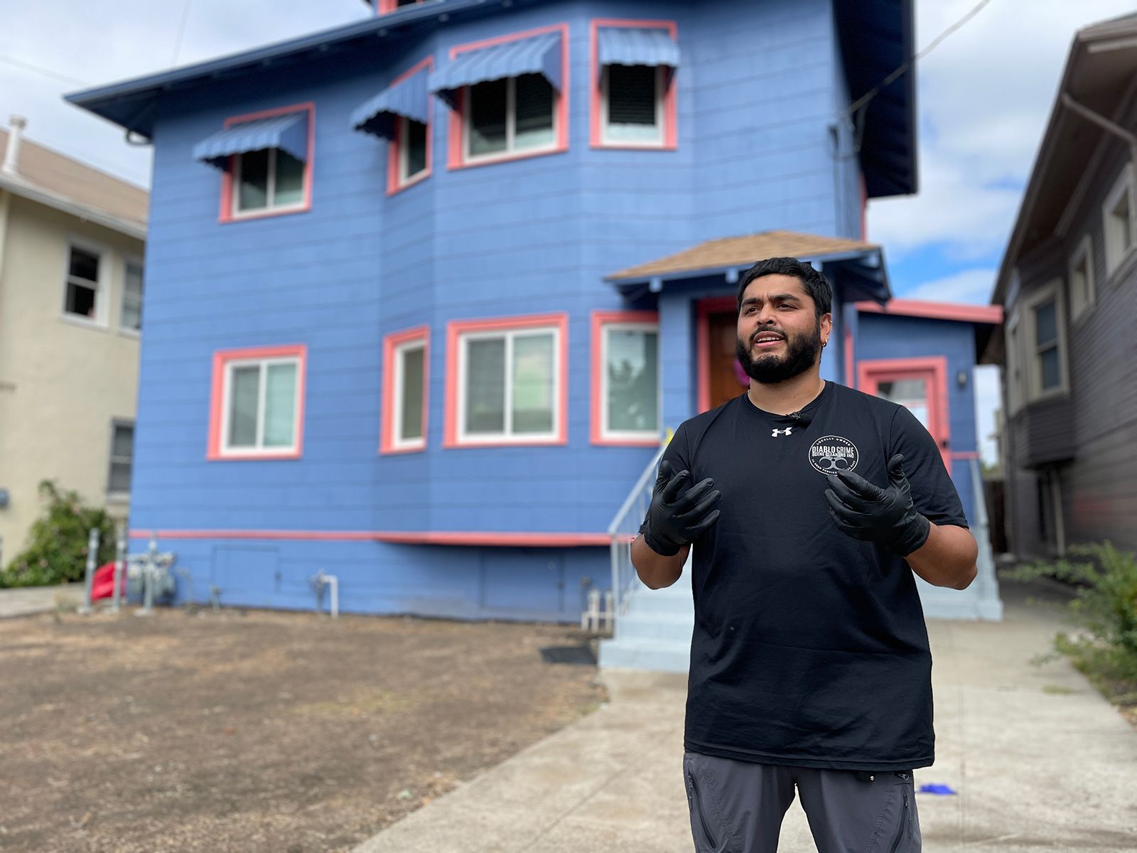 On Sunday afternoon, Diablo Crime Scene Cleaners staff worked quietly outside of a blue house with pink trim, scrubbing the driveway to remove blood from the concrete.