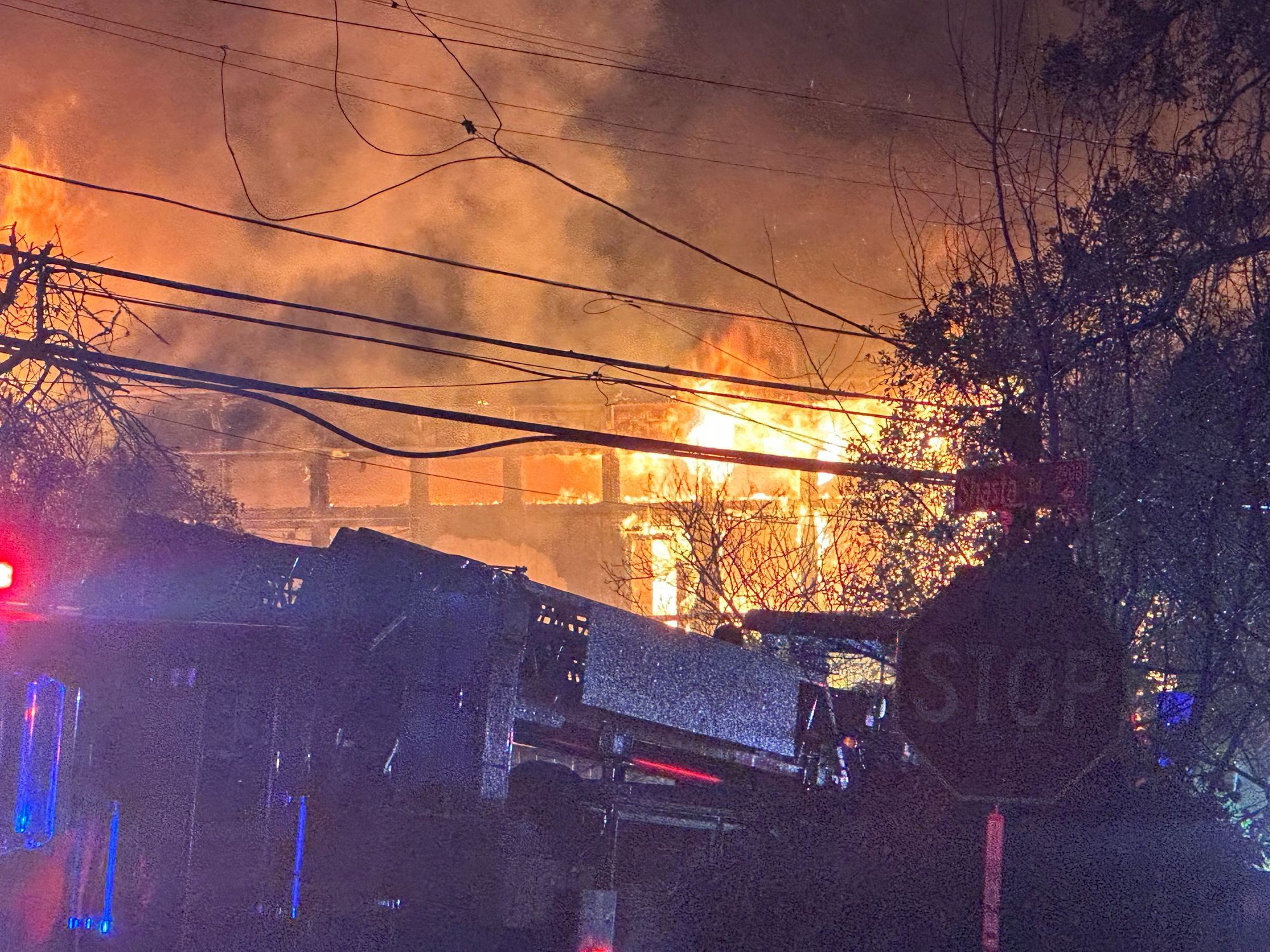 Flames did burn through high-voltage PG&E power lines on the block, which dropped into the street and were sparking.