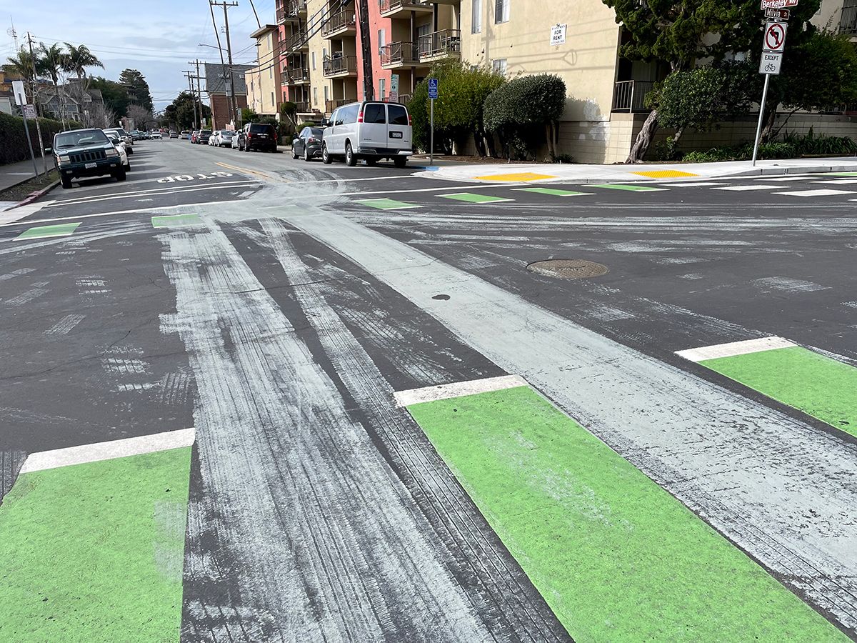 @BerkeleyScanner Pretty low stakes, but have you noticed or heard anything about green/gray paint on streets throughout north Berkeley? Each spot looks like a spill (footprints and tire tracks through it) but seeing it all over.