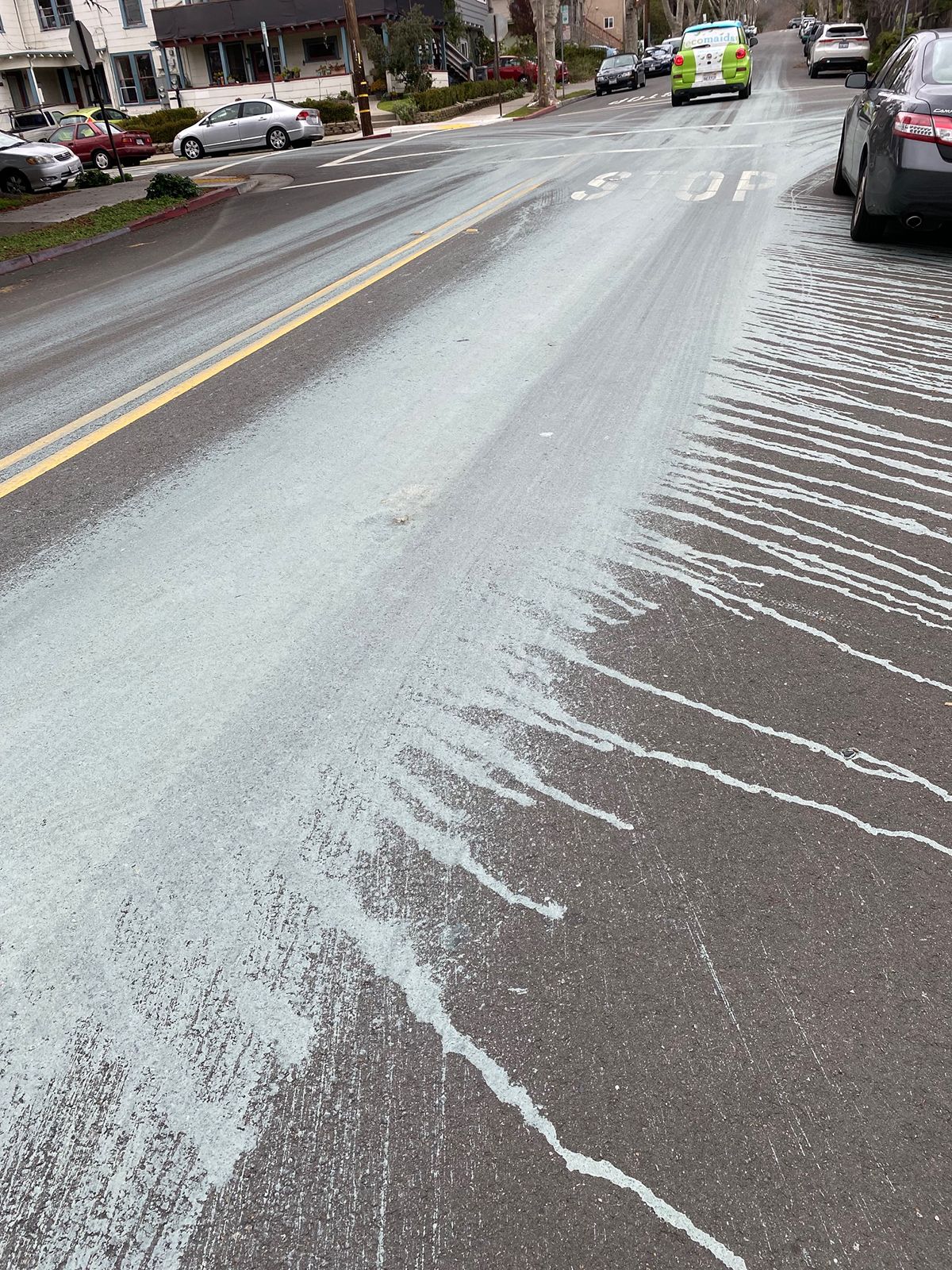 Aaron Gobler noticed a huge powder-blue paint spill on Vine Street near Bonita Avenue in North Berkeley on Jan. 17 and said "vehicles proceeded to spread it for a few blocks in each direction."