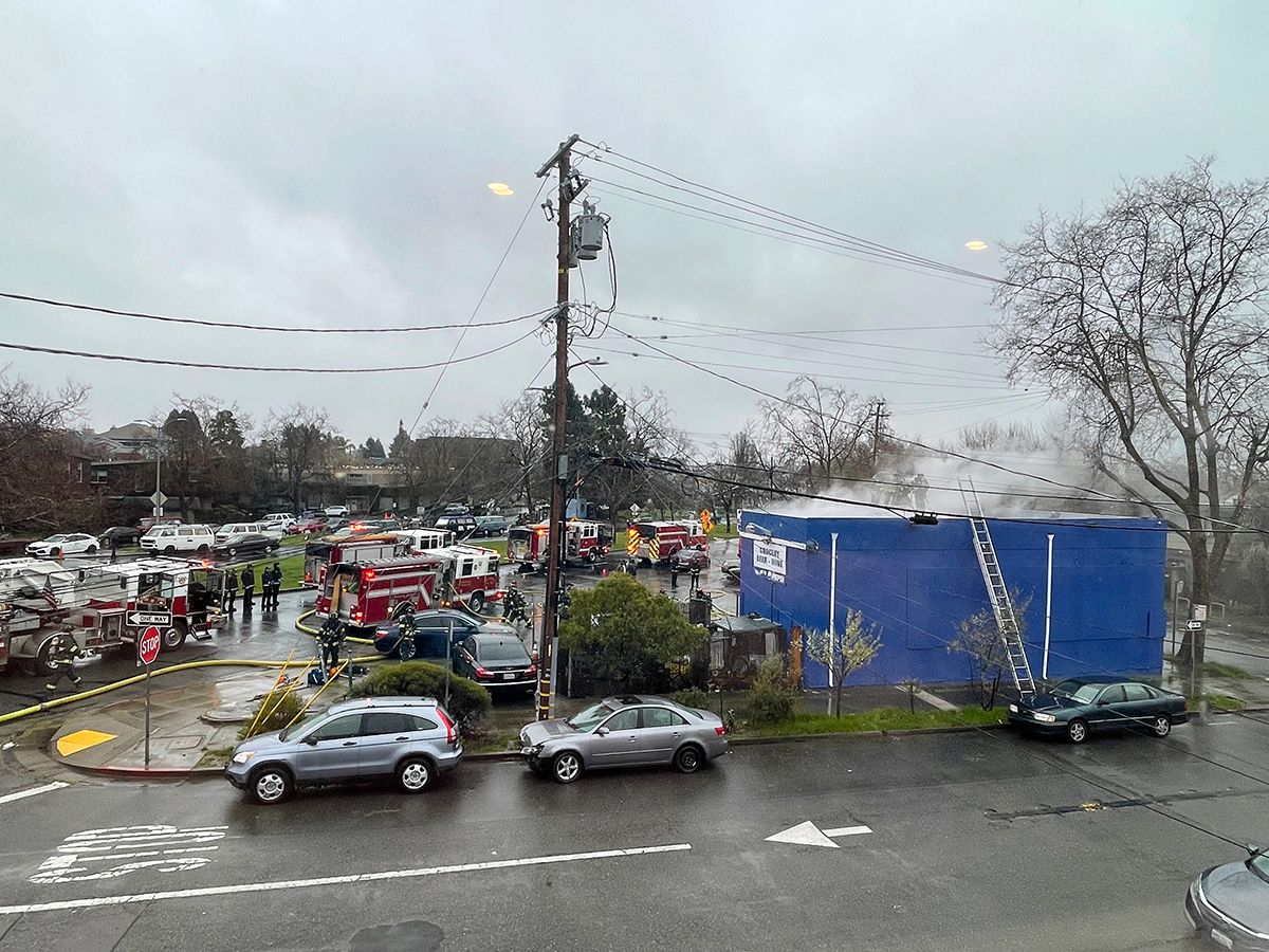 The fire broke out at Stanford Liquor, at 3400 Adeline St. (at King Street), at 11 a.m. Monday.