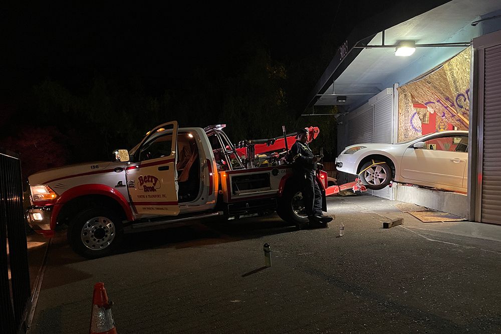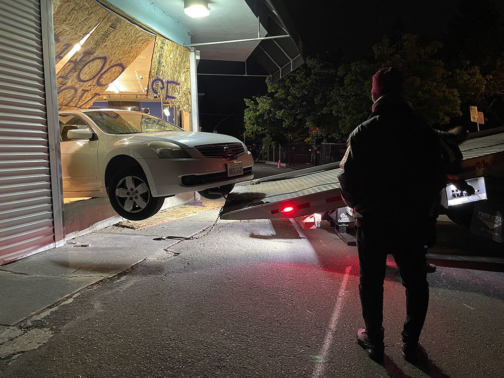 In addition to Berry Brothers Towing & Transport, which removed the security guard's vehicle from CBCB, a city public works staffer also responded to the scene to help fix the broken plywood barrier.