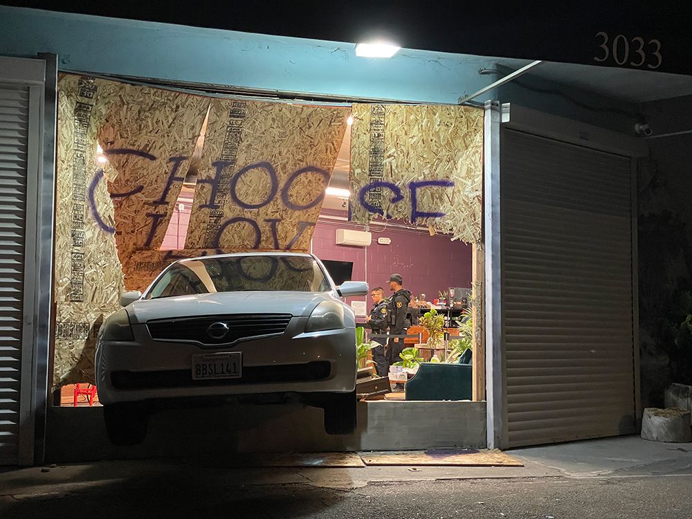 Then they opened the gate and carjacked his vehicle, which they used to ram their way backward into the business through a plywood wall that read "Choose love" in purple spray paint.