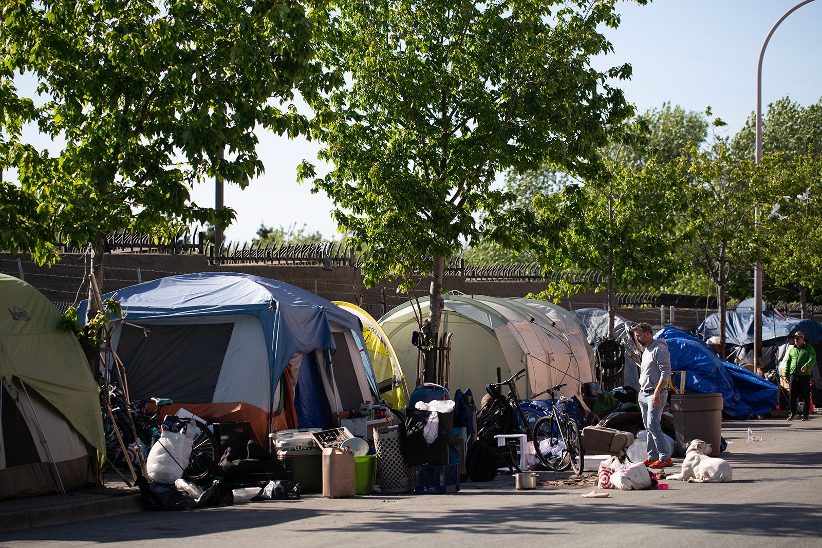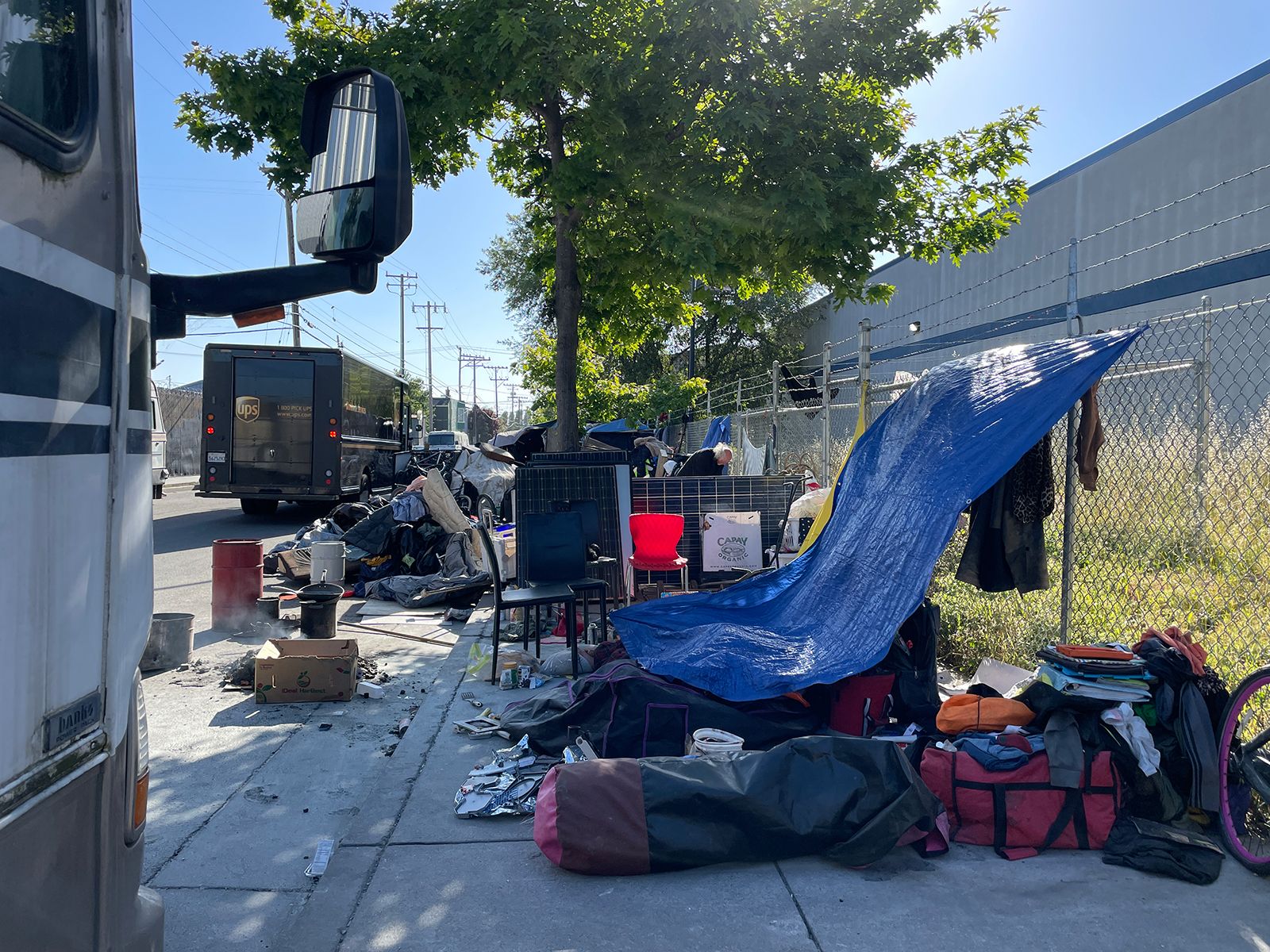 In some parts of Harrison Street, homeless camps and related items now extend out into the roadway, blocking a lane of traffic.