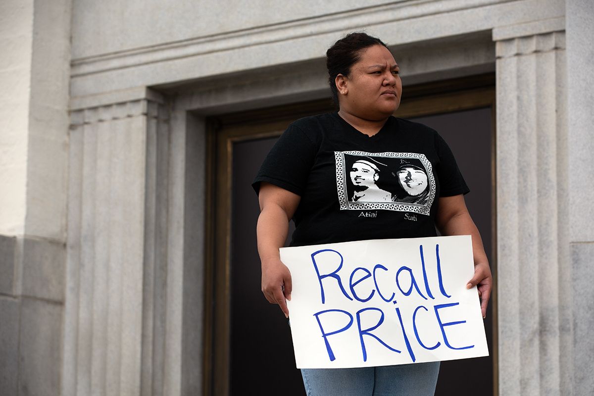 Their signs called for justice for their loved ones and for the recall of Pamela Price, who was elected in November by 53% of the vote on a promise to disrupt the status quo and address racial disparities in the criminal justice system.