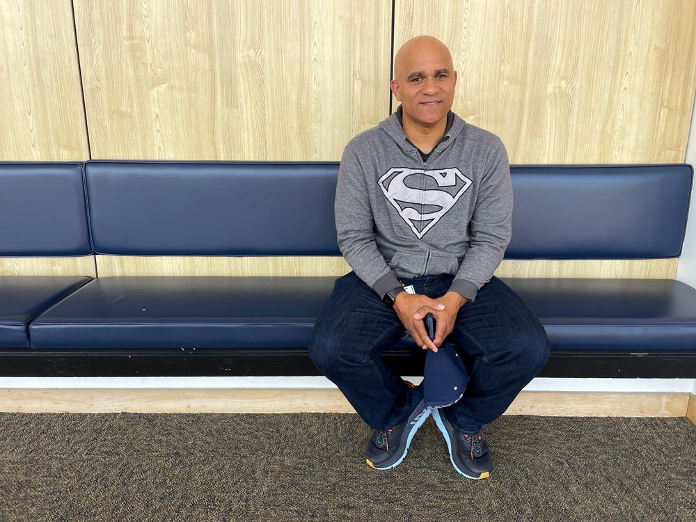 Instead, he wore a gray hoodie featuring a large Superman emblem.
