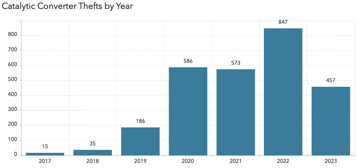 Most significantly, catalytic converter thefts saw a major reduction, going from a high of 847 in 2022 down to 457 last year, the lowest number since these thefts jumped from fewer than 200 in 2019 to nearly 600 in 2020.