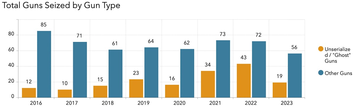 In 2022, BPD recovered 115 firearms, including 43 unserialized "ghost" guns. Last year, BPD seized 75 guns, 19 of which were ghost guns.