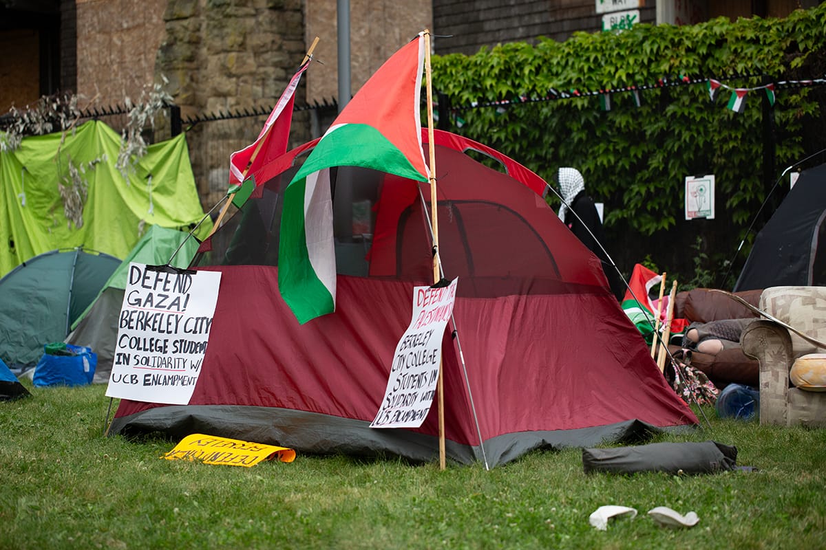 The protesters took over Channing Hall around 1 p.m. Wednesday, according to a notice sent by UC Berkeley. Over the next 24 hours, supporters set up tents on a lawn in front of the hall and erected wooden pallets to form a fence.