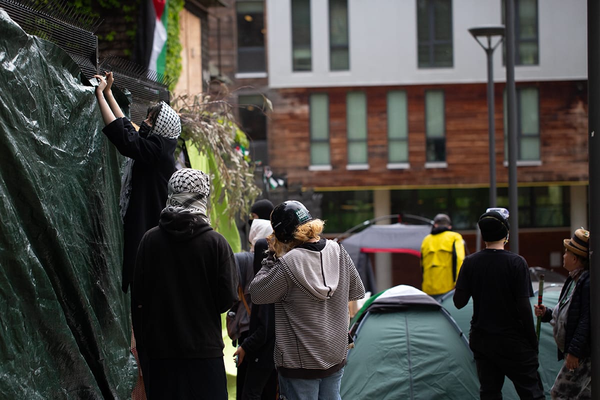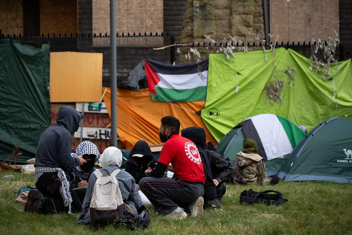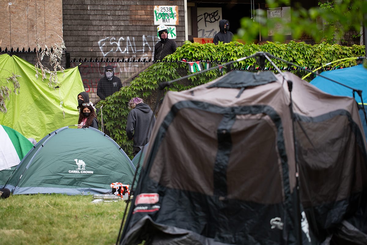 It is unclear who is organizing this protest and what their demands are. On Thursday, about 20 protesters were sitting around the property. They all had their faces covered with masks and keffiyehs and declined to talk to this reporter, not even to state what they wanted from the university.