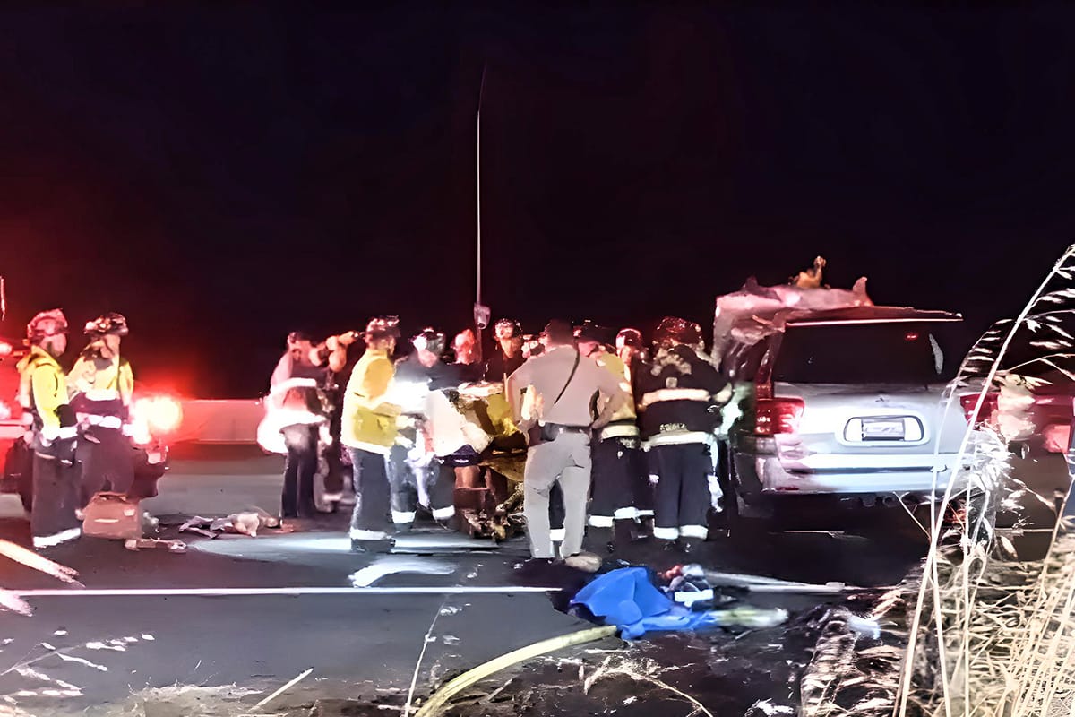 "The SUV was upright but sideways, blocking the two middle lanes of the freeway," she said. "There was debris, a lot of debris, scattered everywhere, not just weeds from the shoulder and pieces from the SUV."