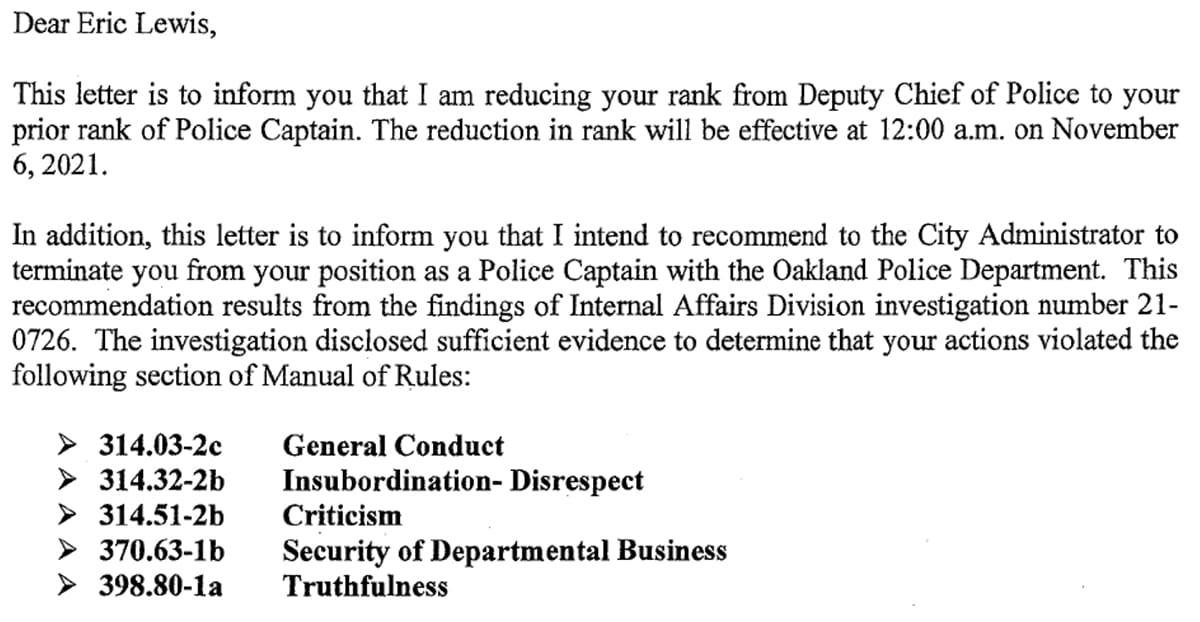 In a letter dated Nov. 5, 2021, then-OPD Chief LeRonne Armstrong demoted Lewis from his appointed role as deputy chief to his prior rank of captain.