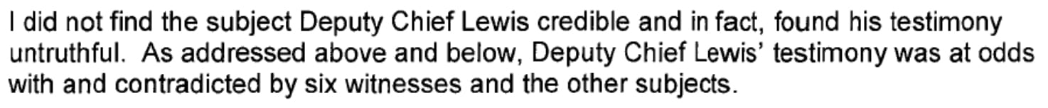 "I did not find the subject Deputy Chief Lewis credible and in fact, found his testimony untruthful," the attorney concluded in November 2021. "Deputy Chief Lewis' testimony was at odds with and contradicted by six witnesses and the other subjects."