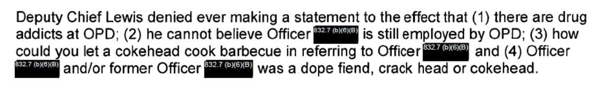 The meeting was not recorded, but she and others said Lewis had said something along the lines of "who let a meth head or crackhead barbecue" and made a reference to the officer living in "the ghetto of Oakland," the investigator wrote.