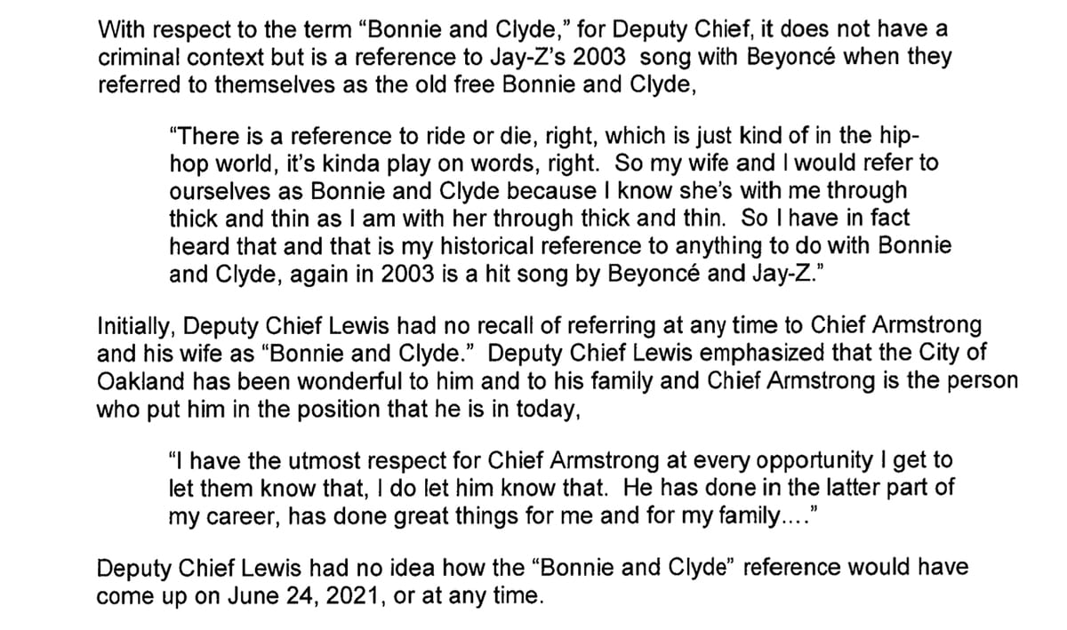 She continued: "I found it disrespectful to discuss Chief Armstrong's marital relationship in any context with OPD members. I also found his lack of consideration that others might associate a reference to 'Bonnie and Clyde' with criminal conduct as disingenuous."