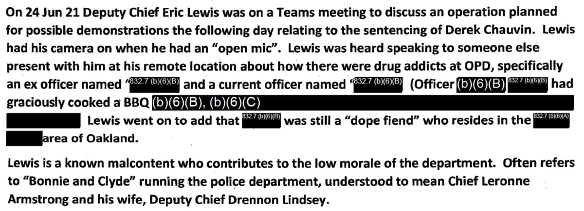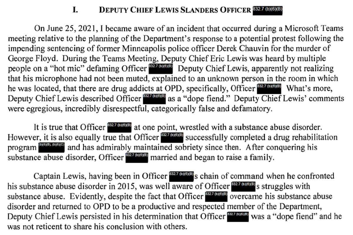 The note said then-Deputy Chief Eric Lewis had been overheard on a Microsoft Teams meeting making disparaging remarks about "how there were drug addicts at OPD."