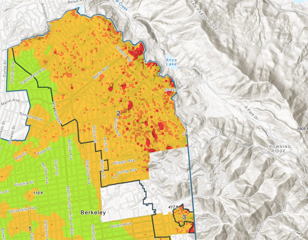 CalFire also calculates wildfire severity hazard zones statewide, using factors such as weather, topography, vegetation and fire history. Berkeley uses this data to create its own wildfire hazard zones, which virtually overlap with the state's.