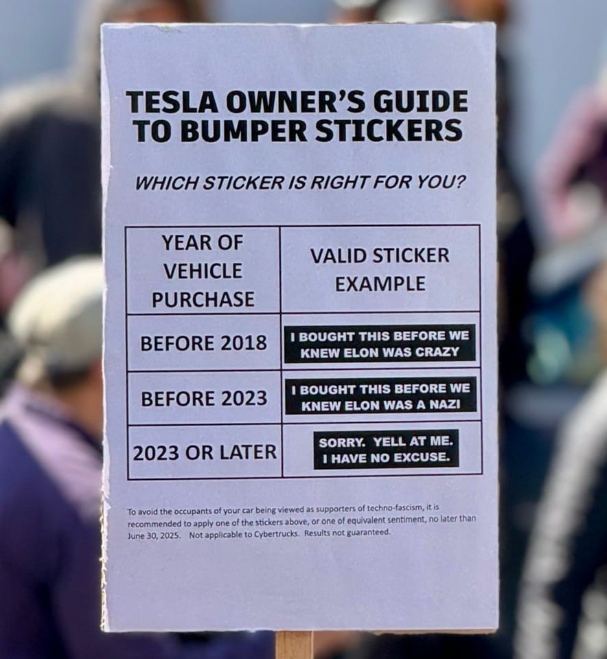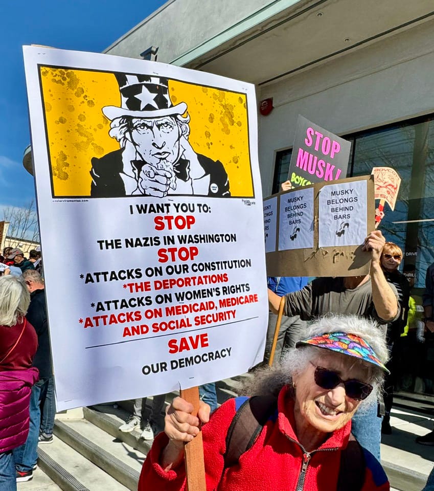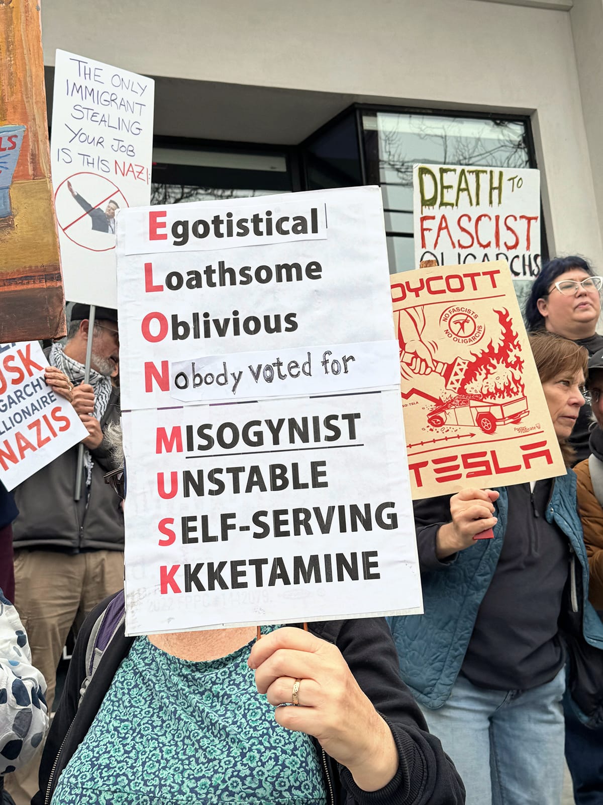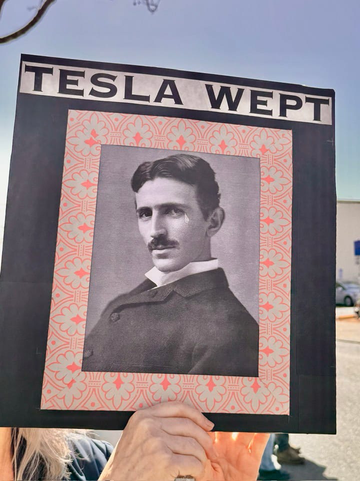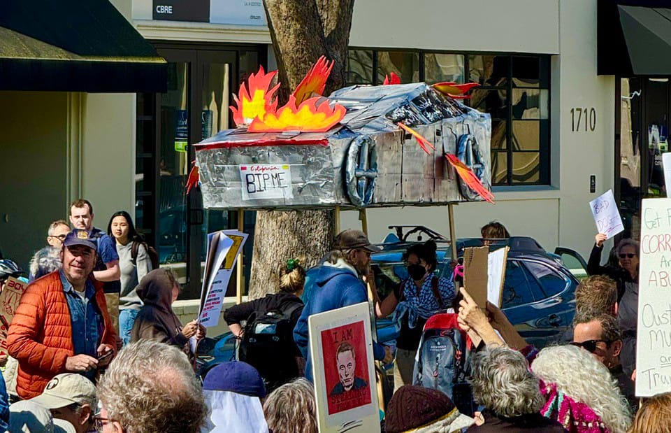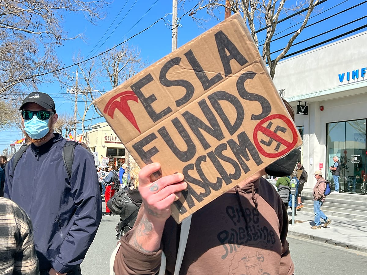Photographs from the March 1, 2025, "Tesla Takedown" protest on Fourth Street in Berkeley. Phil Rowntree