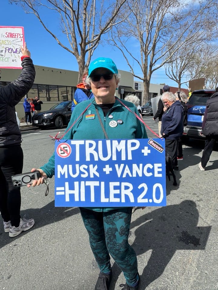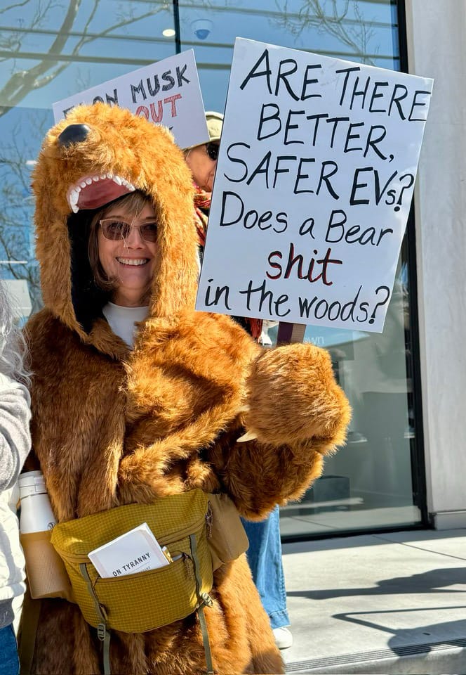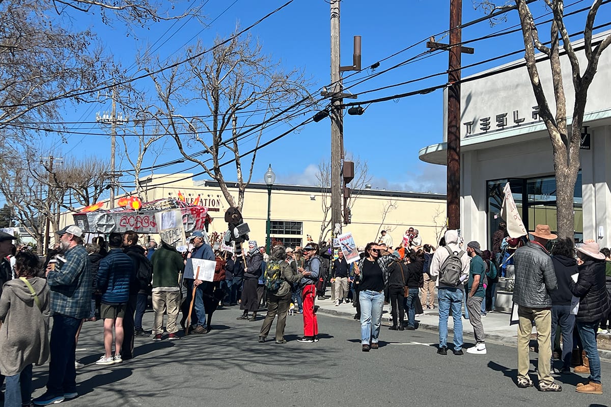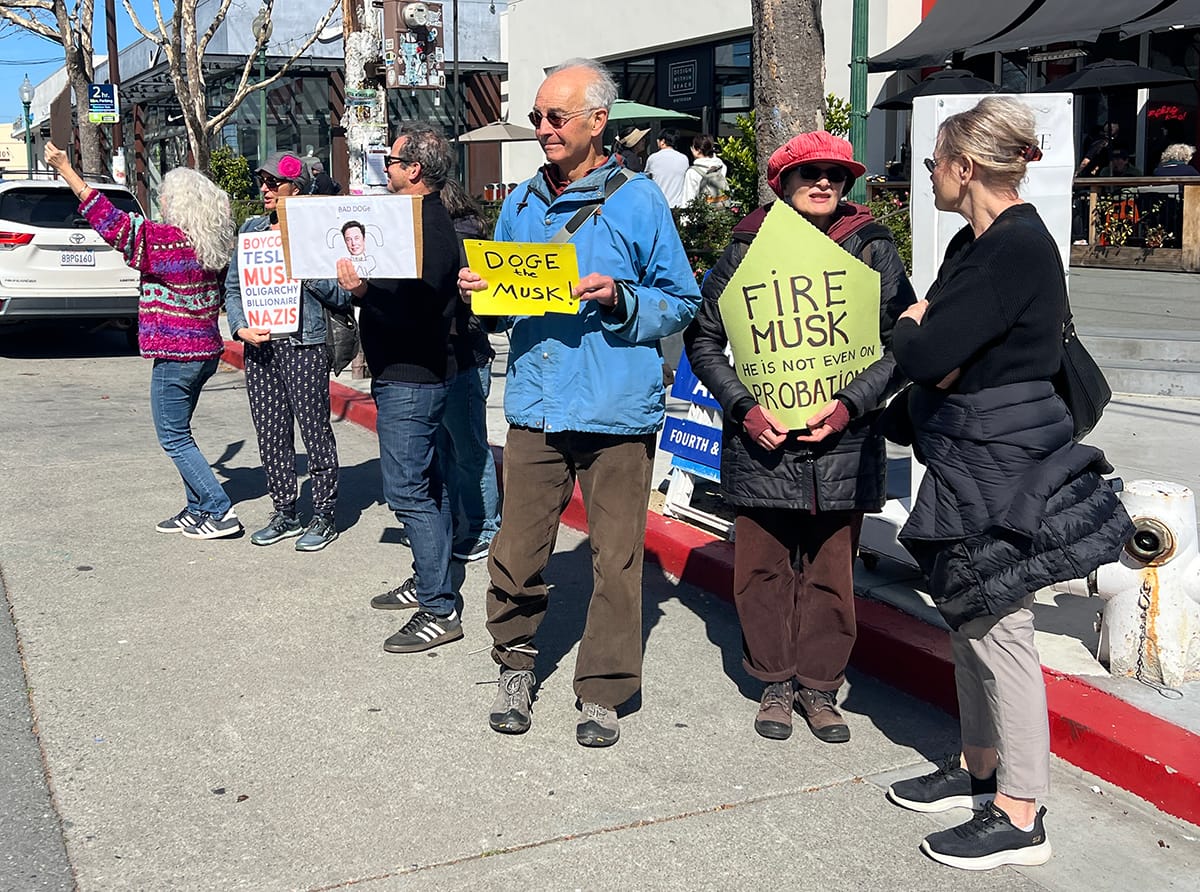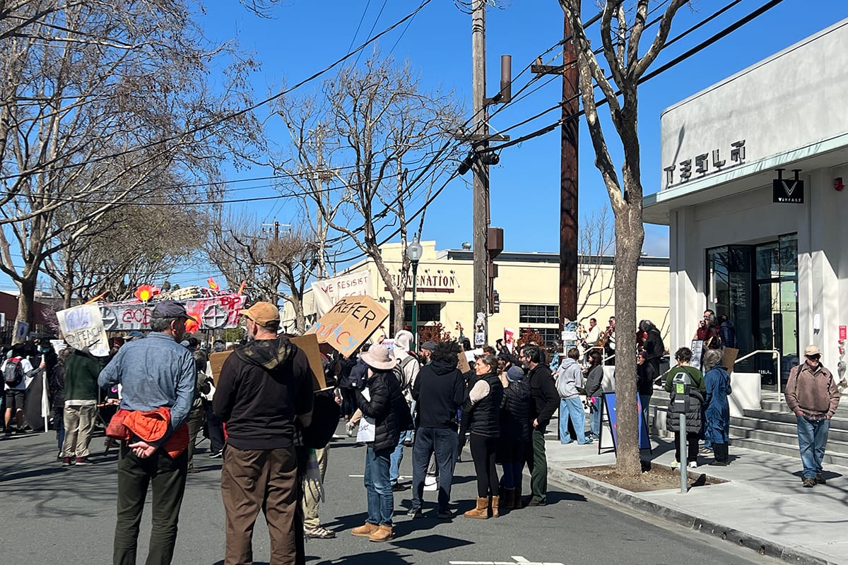 Photographs from the March 1, 2025, "Tesla Takedown" protest on Fourth Street in Berkeley. Sally Francis