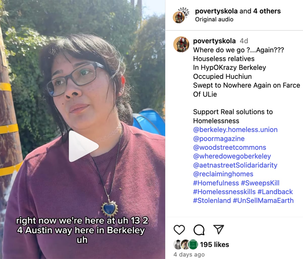 Homeless organizer and advocate Yesica Prado, of the Berkeley Homeless Union, spoke about the events on the group's Instagram page, saying police "just went in there and told people that they had to get out."