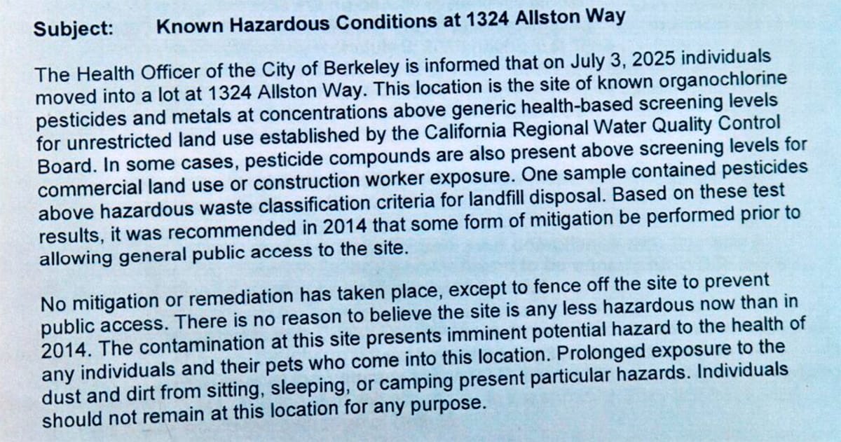 Prince also pointed to a new legal filing by Prado, interim president of the Berkeley Homeless Union, that included the city's recent notices about why the Allston Way property was off-limits — namely contamination caused by pesticides.