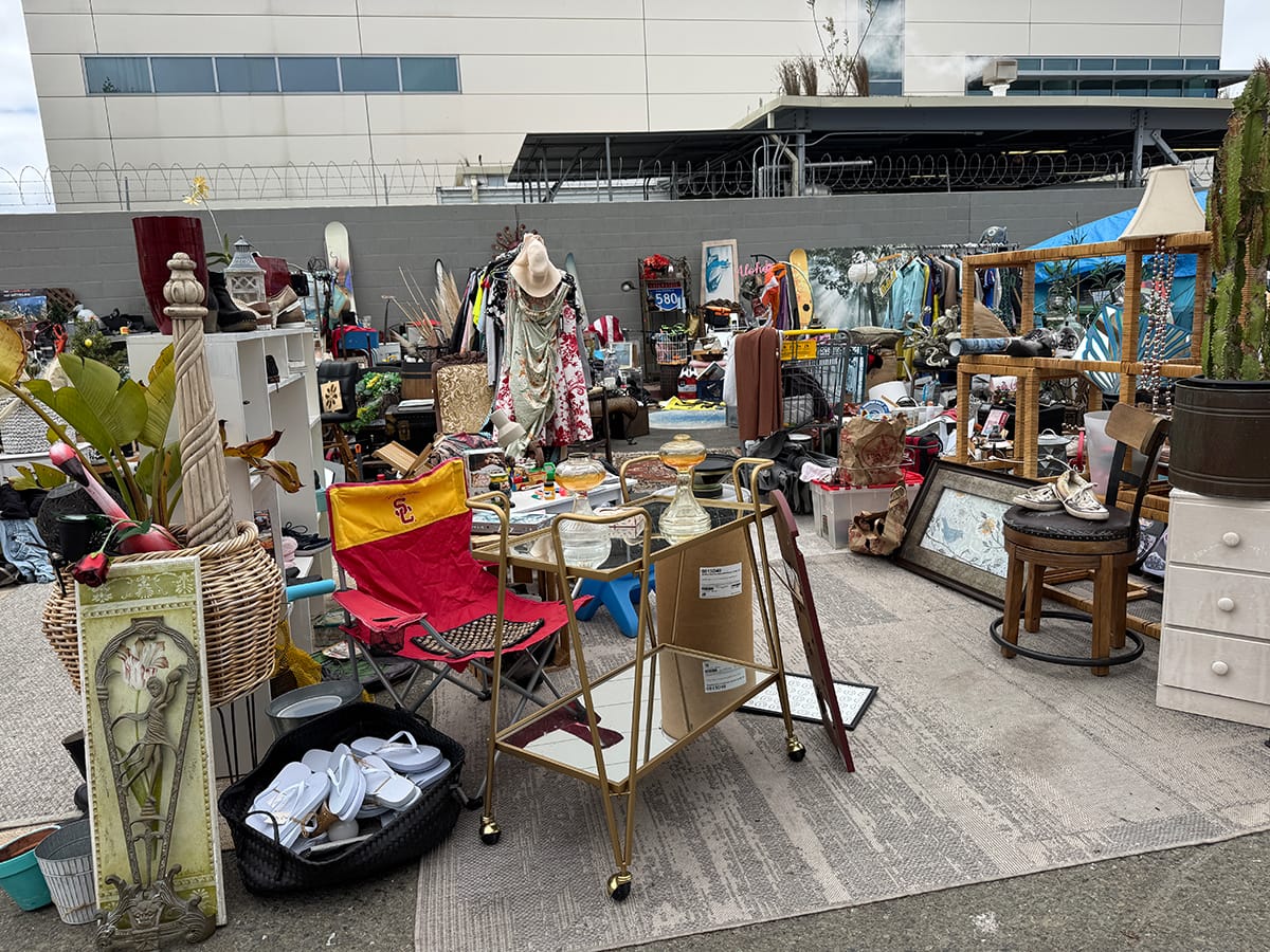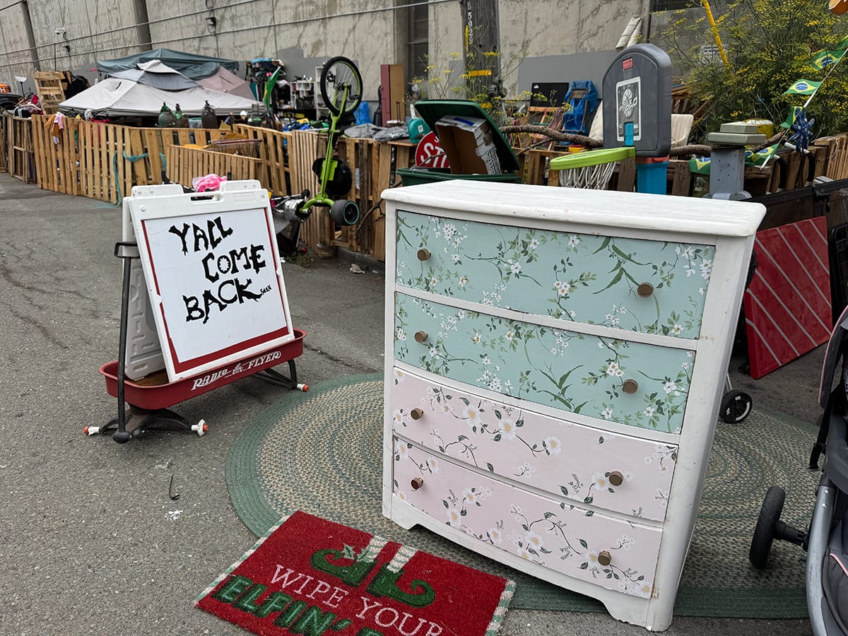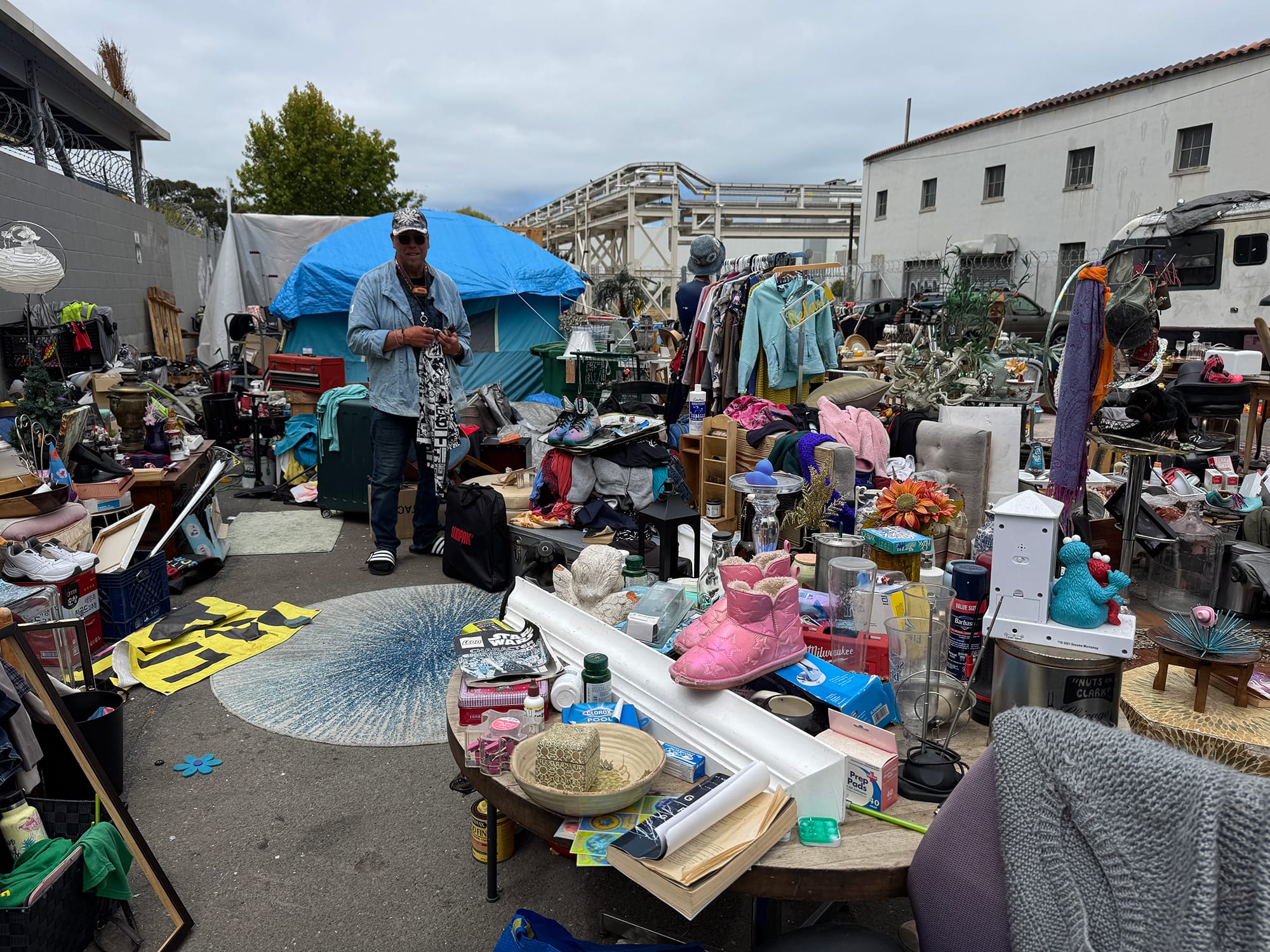 In addition to the scattered tents and parked vehicles, much of the block was taken up by Cowboy's Buy, Sell and Trade, an outdoor market of sorts made up of donated items and property recovered from the side of the road, said Cowboy, its purveyor.