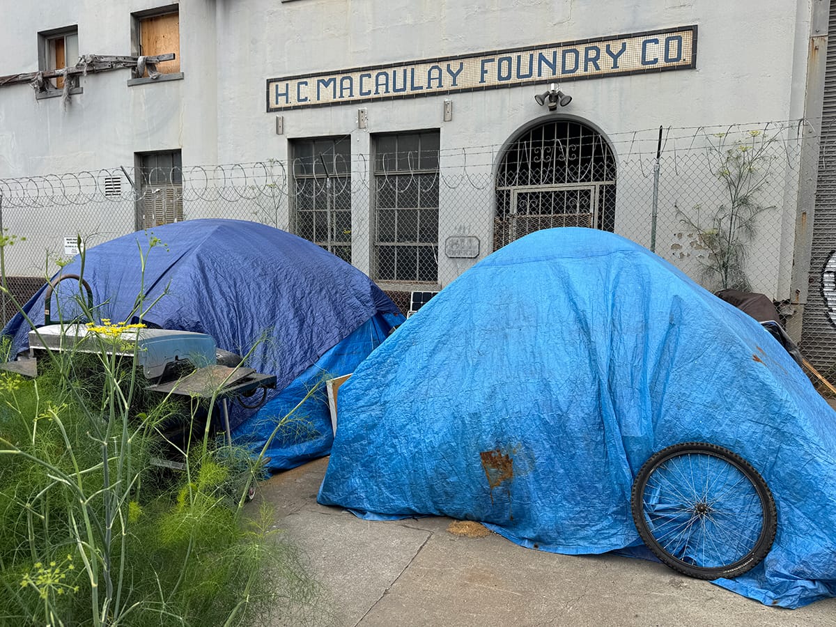 Part of the homeless encampment on Carleton Street west of Seventh Street near Bayer on Wednesday, July 23, 2025. Emilie Raguso/TBS