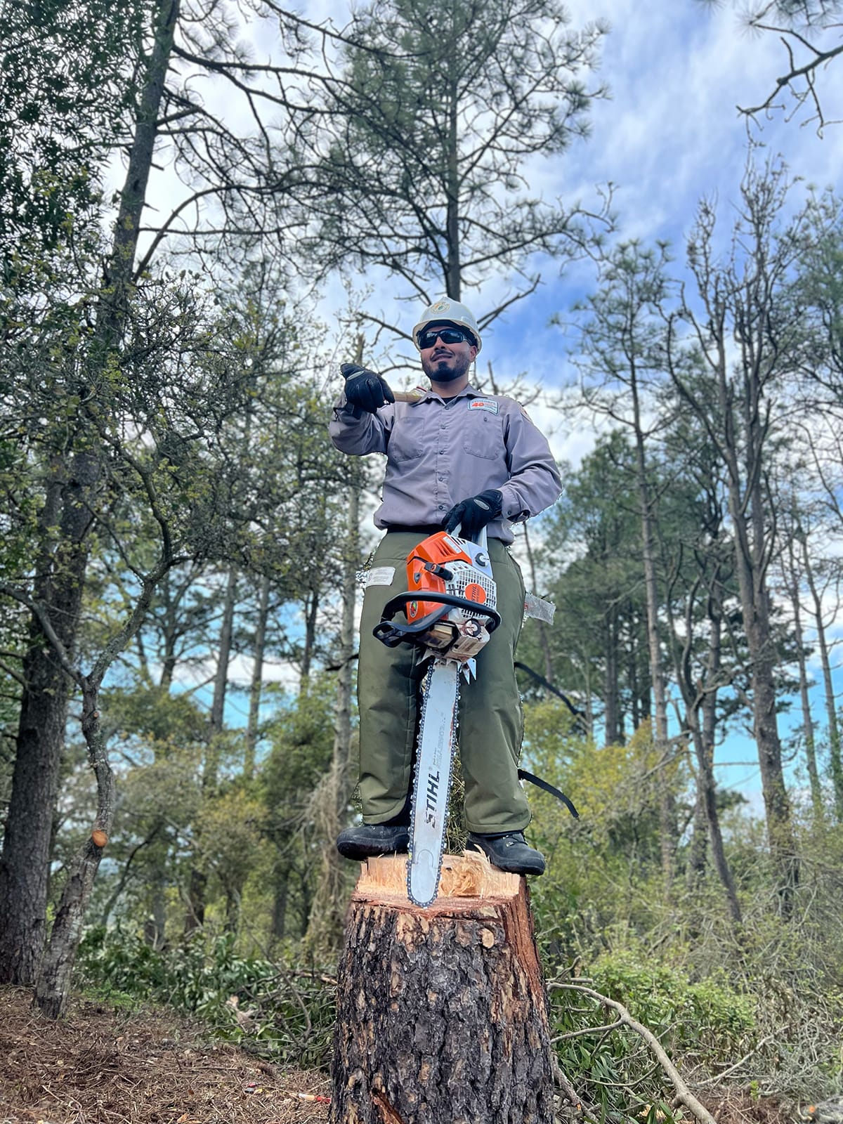 Suledy Montes loves having a sturdy grip on a chainsaw and letting her rip. Cutting through thick dry hunks of Monterey pine, downed by age and winds.