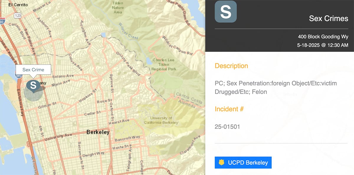 Shortly after publication, the University of California Police Department said the report had been made to a campus authority other than police, which explained the lack of details at this time.