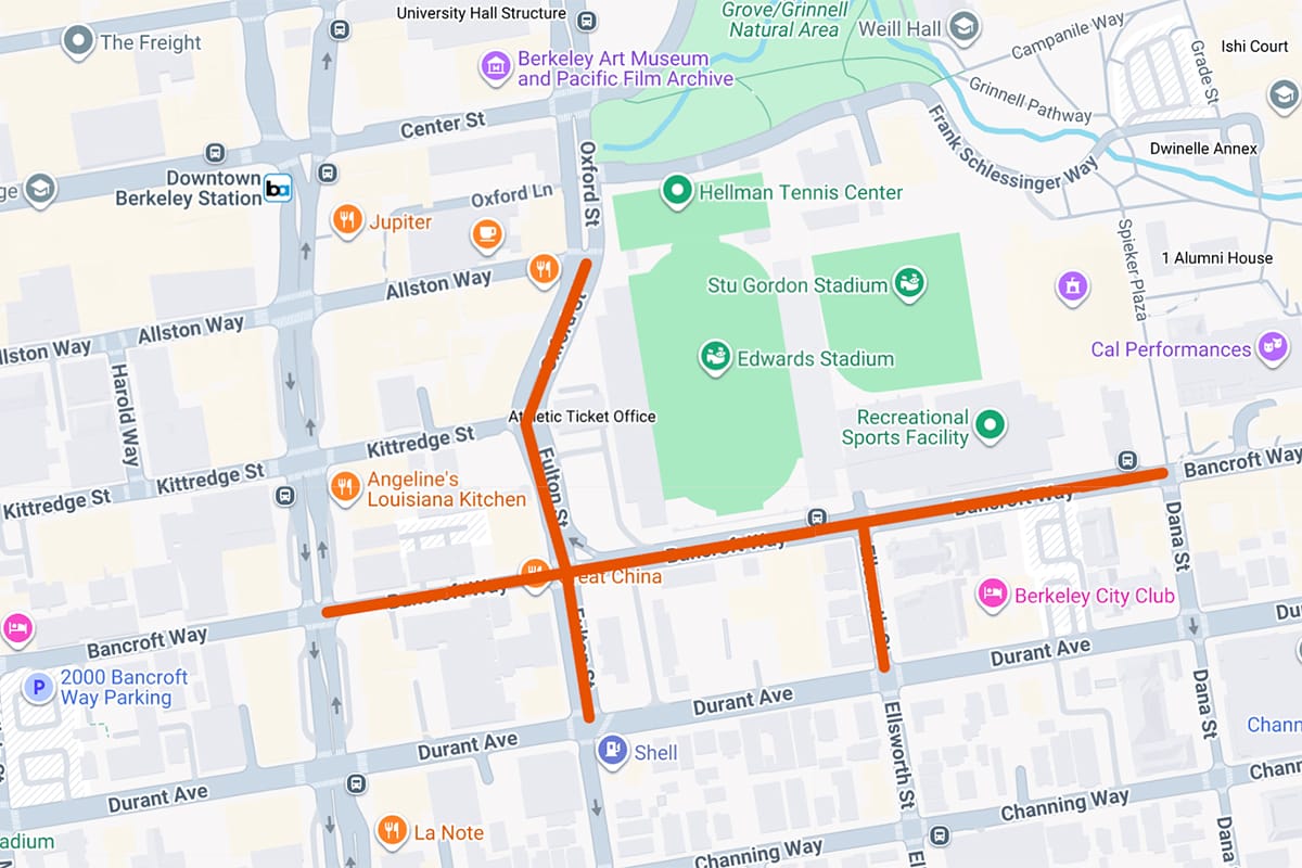 Campus officials said Bancroft Way is closed from Dana Street to Shattuck Avenue; Oxford and Fulton streets are closed from Allston Way to Durant Avenue; and Ellsworth Street is closed from Durant Avenue to Bancroft Way.