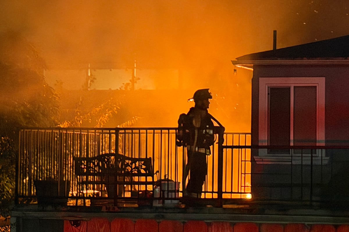 As firefighters worked to douse the blaze, they could see flames coming from a water heater shed behind the property, according to radio traffic.