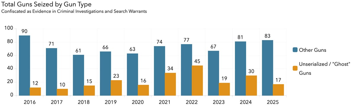 But unserialized ghost gun seizures have dropped significantly, with 30 in 2024 compared to about 17 so far this year, according to BPD data.