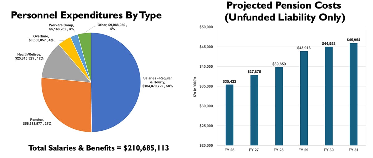 Most of the General Fund spending — $211 million, or 68% — comes from personnel costs, with salaries tallying about 50% ($105 million) and ballooning pension costs and health insurance premiums making up much of the rest.
