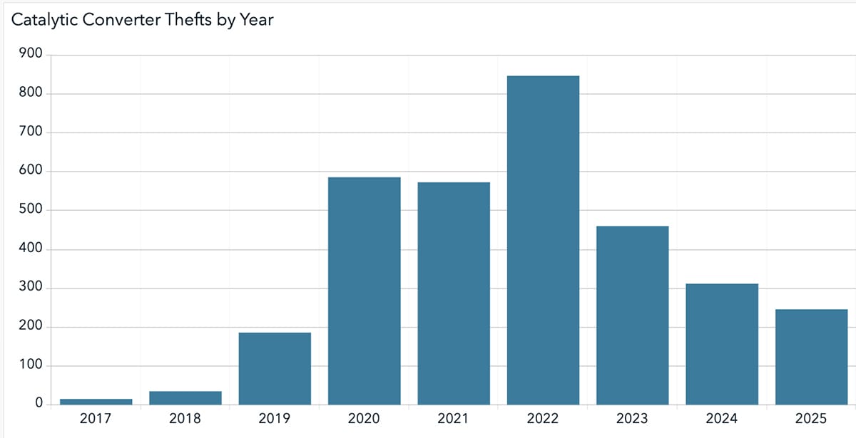 The following year, 2019, nearly 200 catalytic converter thefts were reported in the city. And the next two years saw closer to 600 reports annually.