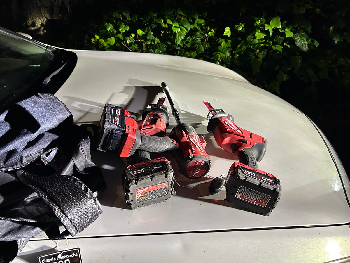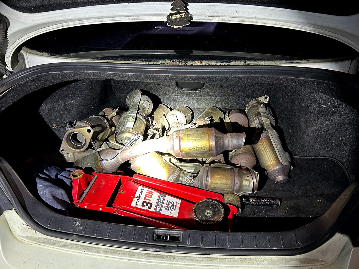 The vehicle was unoccupied, but police found 11 stolen catalytic converters in the trunk along with battery-operated power tools and a floor jack, which are "commonly used in catalytic converter thefts," police said.