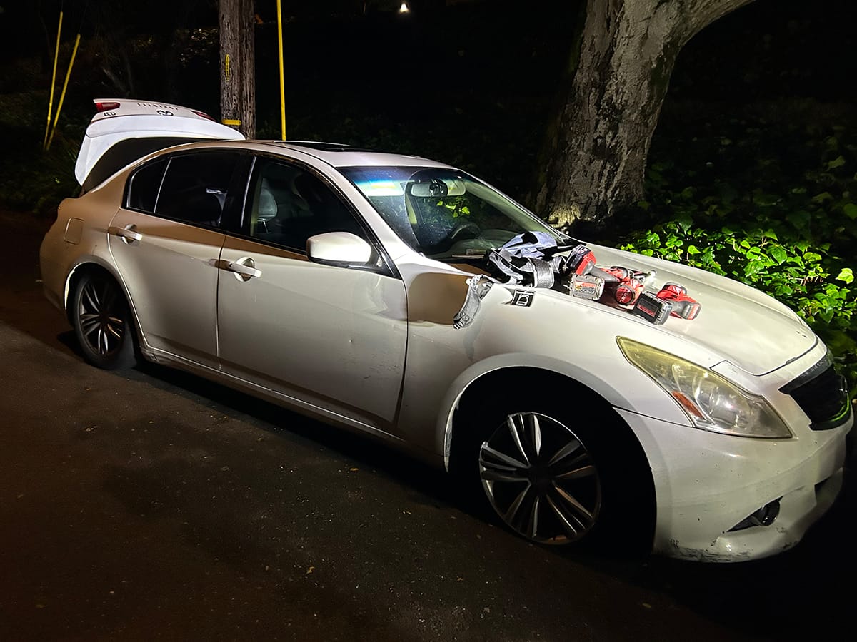 The dumped Infiniti and the pilfered "cats." Berkeley police