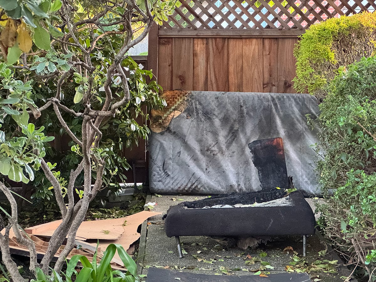 Hours after the fire, a burned mattress and bed frame remained on a walkway in the front yard not far from a burned pile of clothing.
