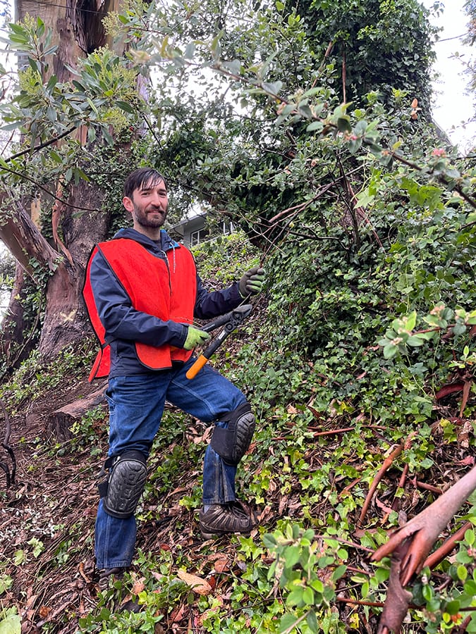 Ryan was among around 300 volunteers who showed up Saturday in the Berkeley Hills to help make the area less susceptible to raging wildfire by cutting back, trimming and removing vegetation; or, in fire management lingo, improving defensible space — a buffer zone around structures that can slow embers and flames.