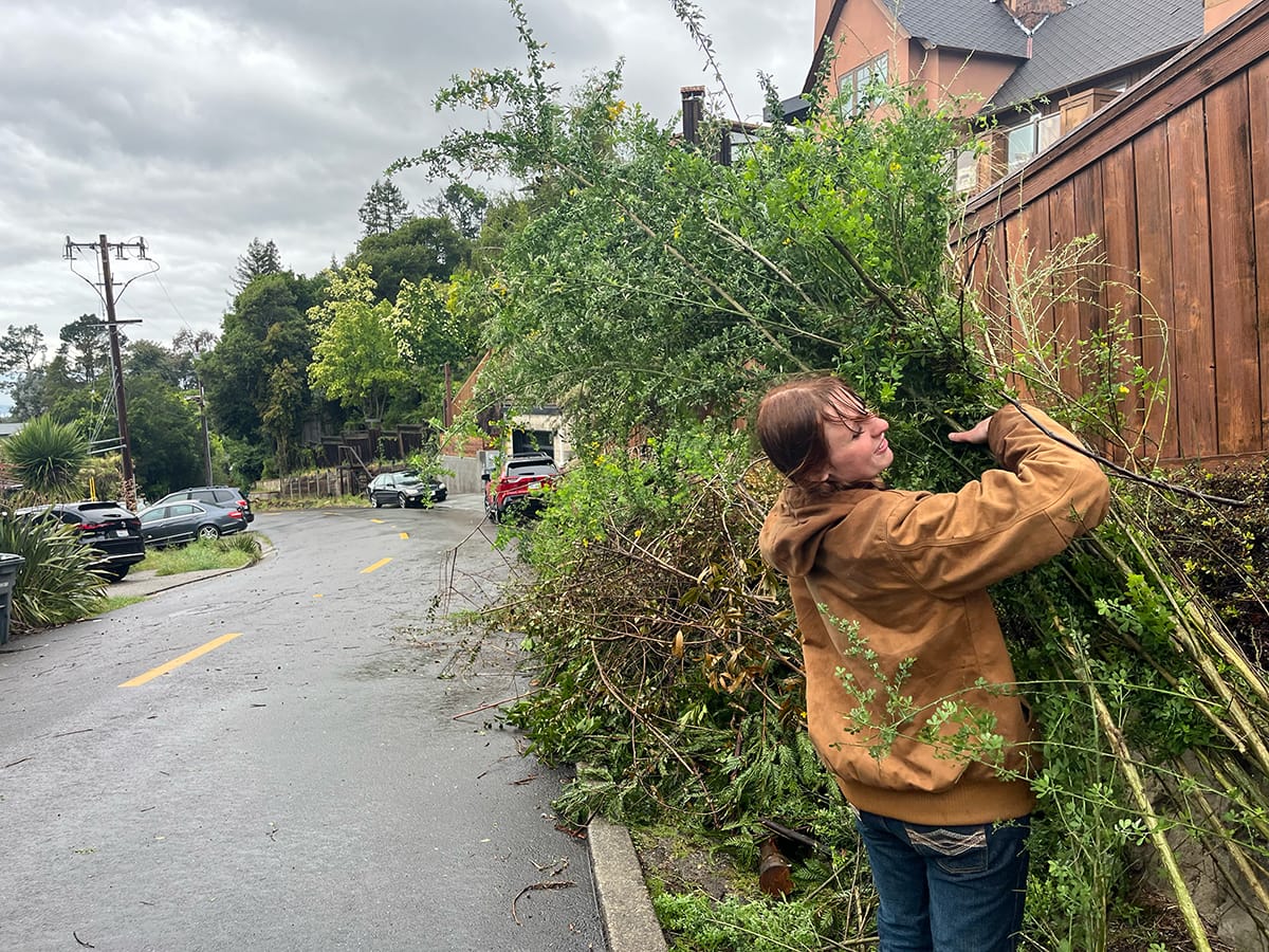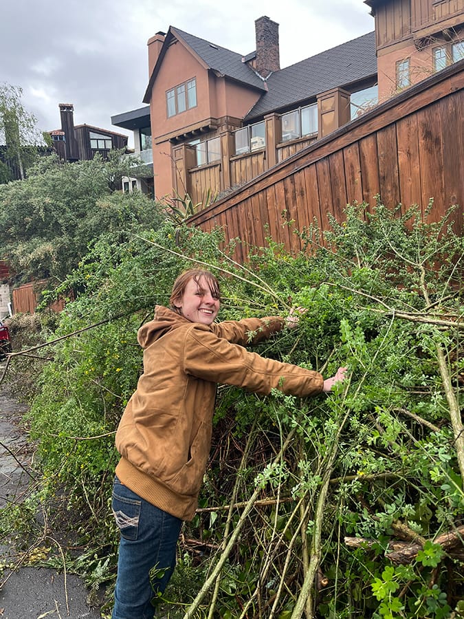 Volunteer Avery Ryan wrangles brush on Miller Avenue. She joined the cleanup on her own, not with a group. Kate Darby Rauch