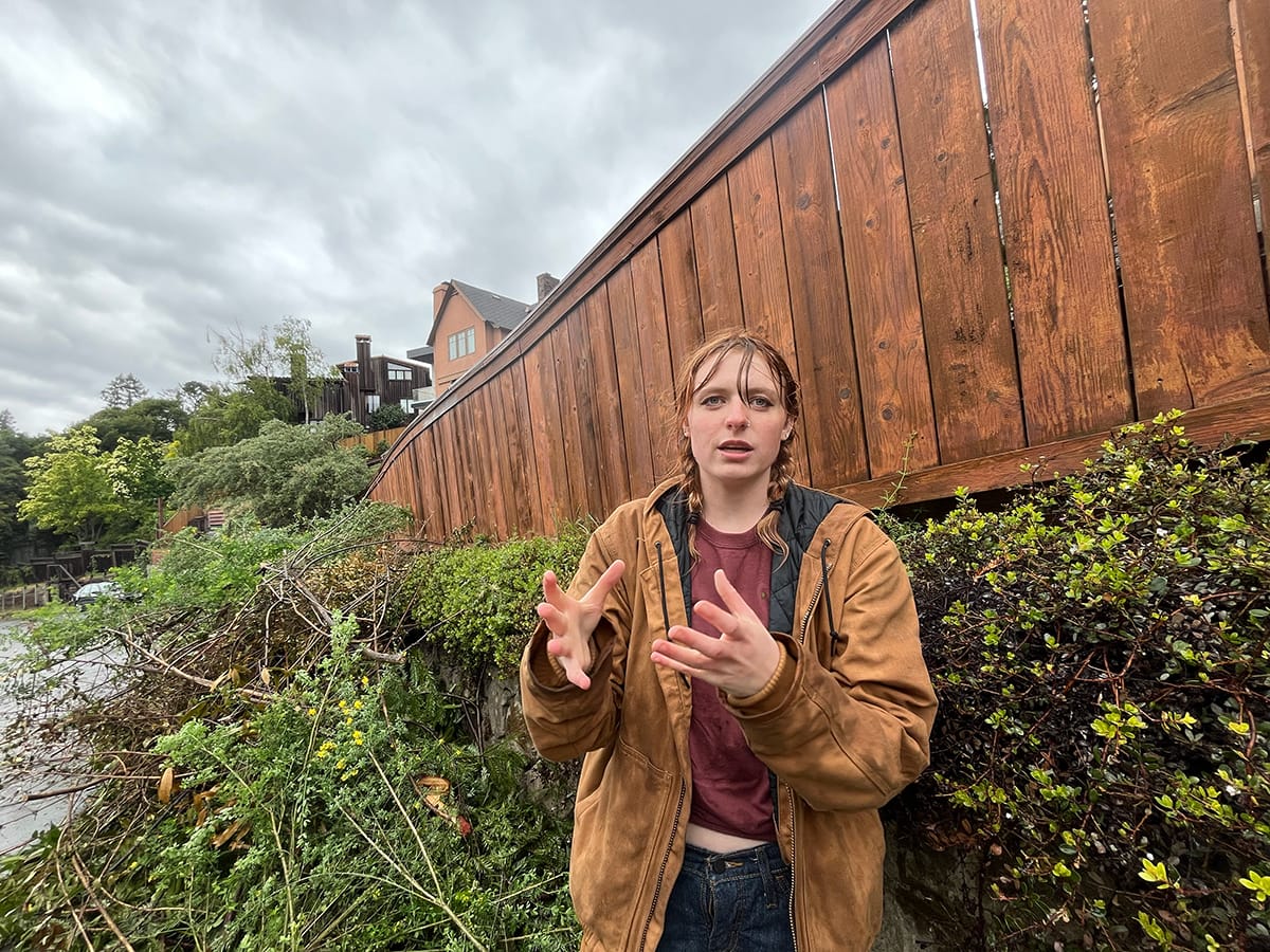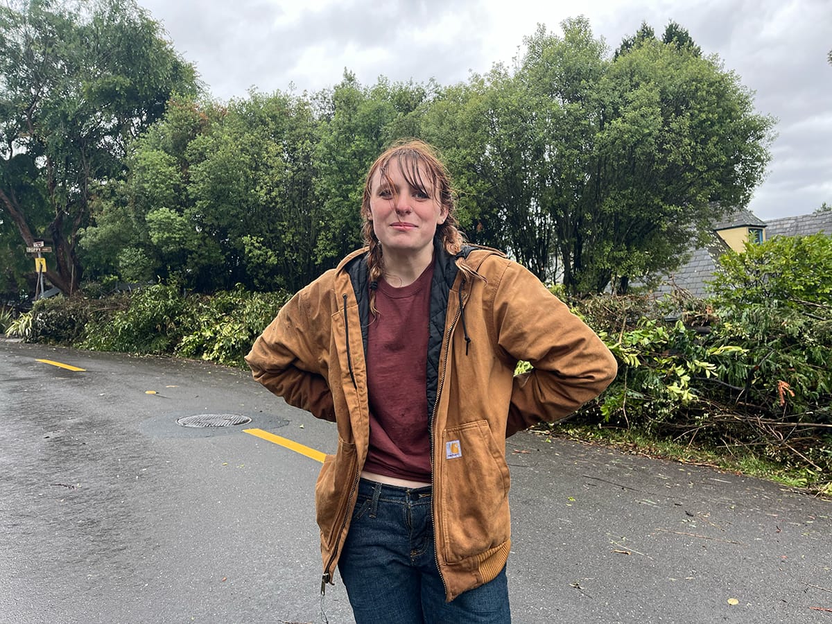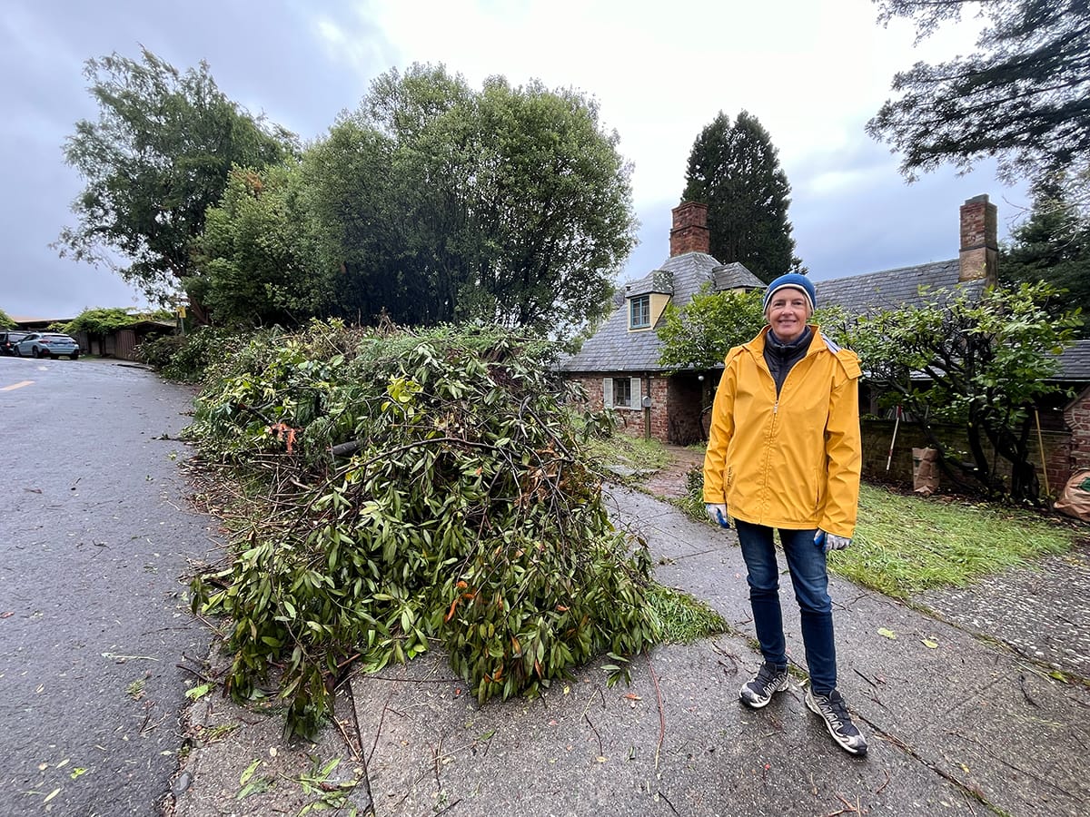 Site manager and neighbor Caroline Winnett next to a massive pile of cut branches on Miller Avenue. Kate Darby Rauch