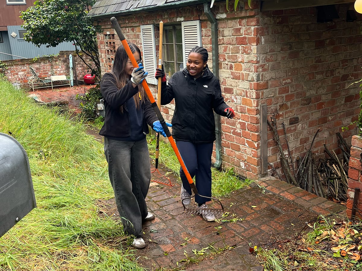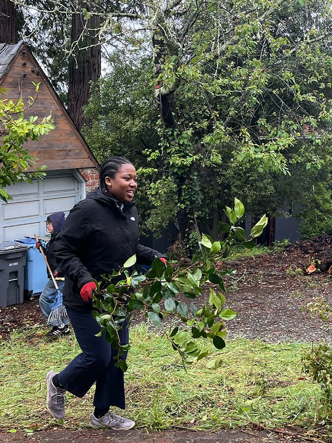 "To know she needs this and seeing her smile, and her gratefulness. I think that's really important — to help people in need," said Omoeghie Obidah, a Cal psychology major volunteering Saturday, speaking about the elderly homeowner whose yard she worked in, cutting back overgrown brush, bagging weeds.