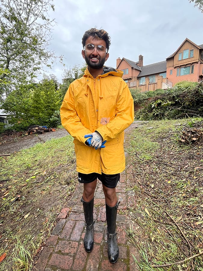 Ajay Krishnan, a UC Berkeley psychology student volunteer (wearing safety glasses) said helping vulnerable residents with wildfire mitigation is uniquely meaningful. He also said he likes doing physical labor in shorts. Kate Darby Rauch